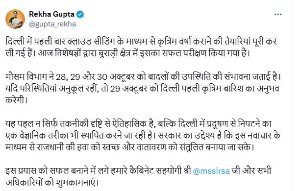 • दिल्ली में 29 अक्टूबर को होगी पहली आर्टिफिशियल बारिश, सीएम रेखा गुप्ता ने की तारीख की घोषणा